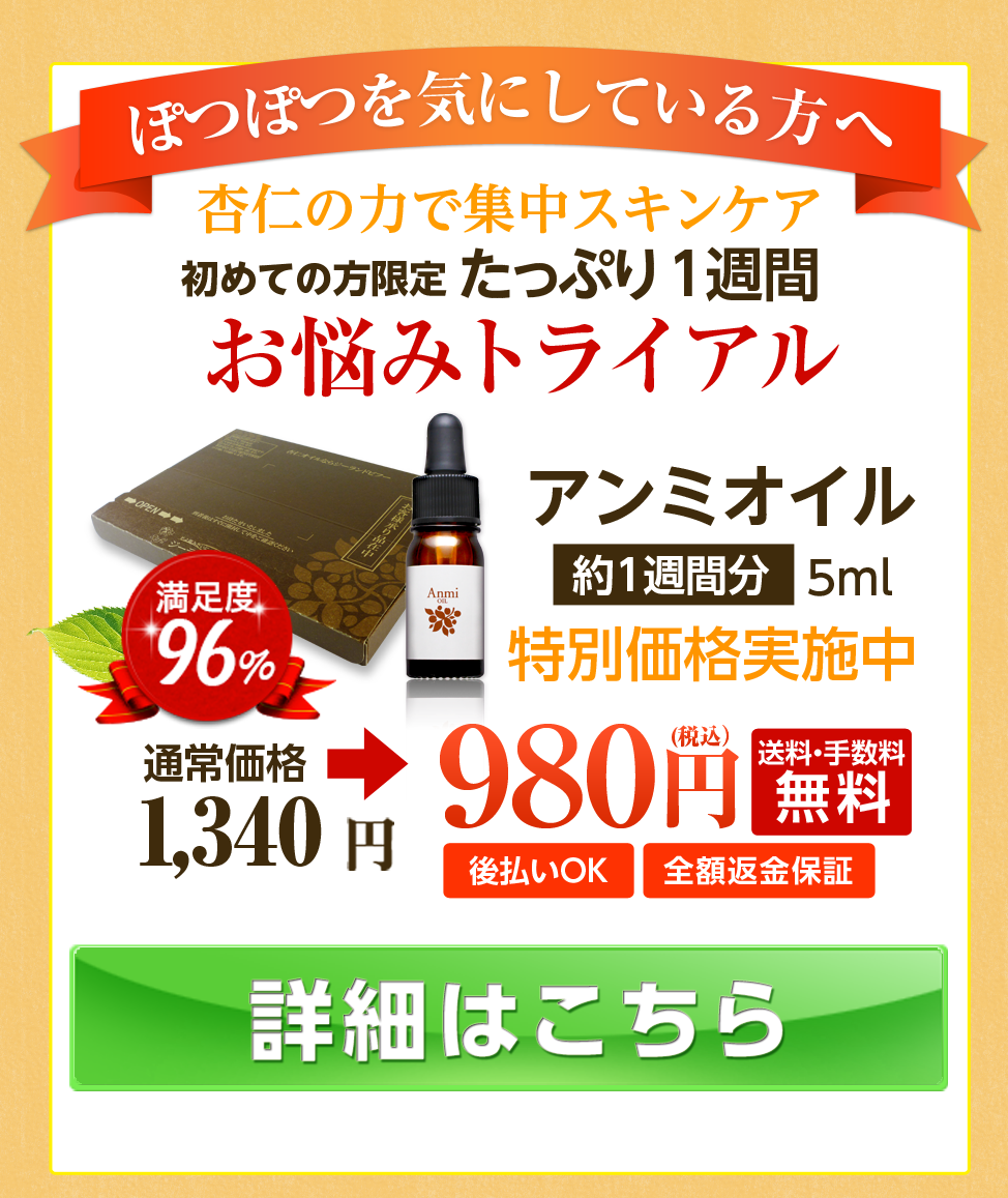 そこで、このポツポツをキレイにする方法として注目されているのが「杏仁オイル」です。